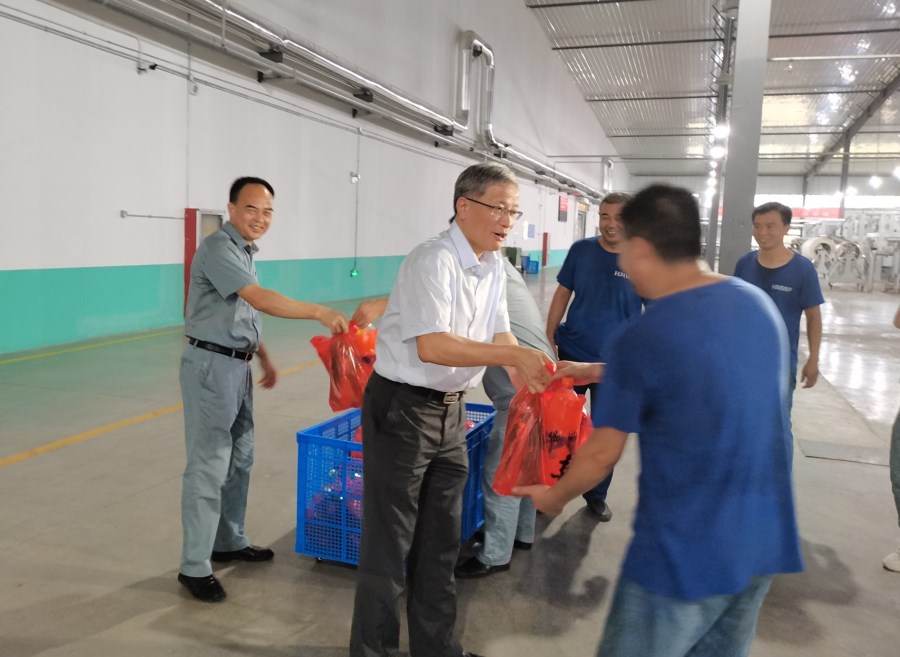 立秋以來,氣溫不降反升,天氣持續高溫酷熱,安徽華茂各單位生產一線的員工都奮戰在崗位上,戰高溫、保質量、奪高產。8月20日,市政府副秘書長李文勝在市總工會副主席徐玲華的陪同下,來到華欣公司慰問堅守在一線的員工,并送上防暑降溫物品。